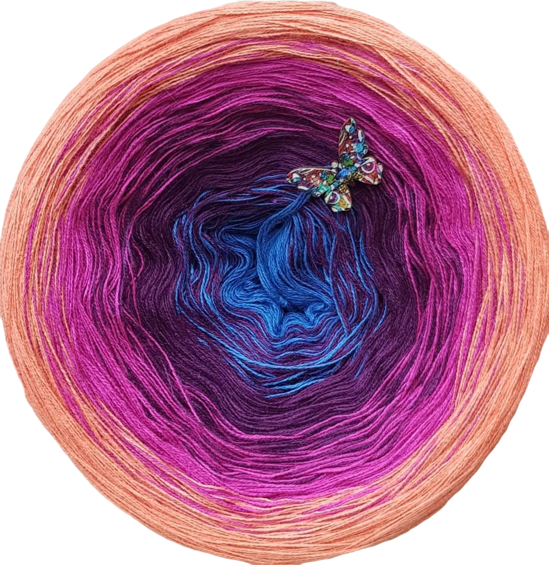 skład : bawełna/akryl 50%/50% Motek składa się z 3 lub 4 nitek , które nie są ze sobą skręcone , kolory zmieniają się nitka po nitce . Przejścia kolorów nie są równe , lecz są proporcjonalne ,co oznacza , że środkowego koloru jest najmniej a zewnętrznego najwięcej . Pozwala to na uzyskanie efektu równych pasów w chustach. Zalecane użycie motka@ombre – od środka . Zalecane szydełko 2-4mm Jakiej długości potrzebujesz ? 500m-mała chusta dla dziecka 1000m – średnia chusta , prosty wzór 1500 – duża chusta , prosty wzór 1800-2000m – chusta z dużą ilością reliefów . Staramy się aby zdjęcia odzwierciedlały jak najdokładniej rzeczywiste kolory przędzy jednak mogą one się w niewielkim stopniu różnić od rzeczywistości Zawieszka jest elementem dodatkowym , nie obowiązkowym . Staramy się aby utrzymać ciagłość kolorów lecz z powodu dostaw różnych partii towaru , odcienie mogą się nieznacznie różnić