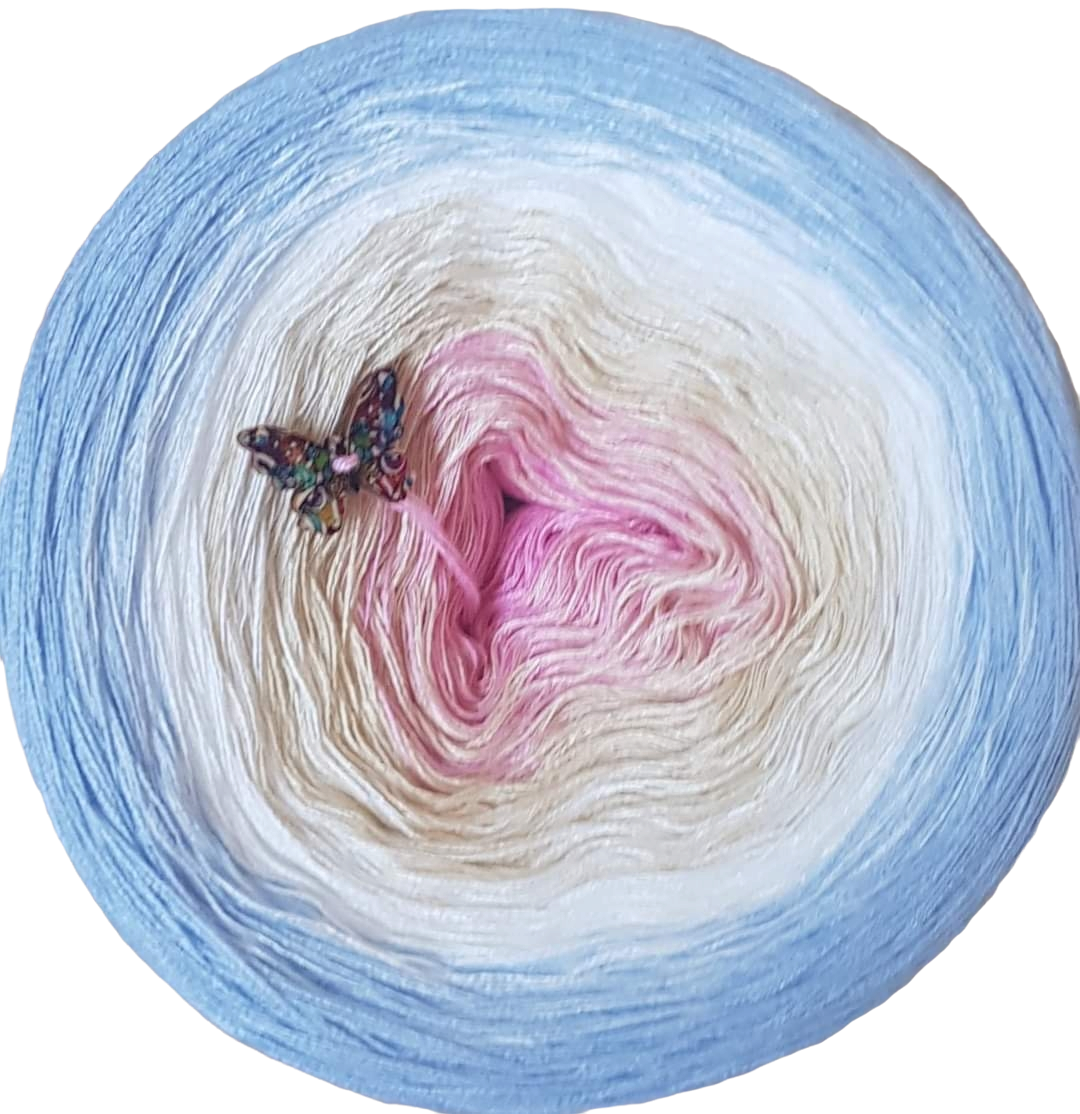 skład : bawełna/akryl 50%/50% Motek składa się z 3 lub 4 nitek , które nie są ze sobą skręcone , kolory zmieniają się nitka po nitce . Przejścia kolorów nie są równe , lecz są proporcjonalne ,co oznacza , że środkowego koloru jest najmniej a zewnętrznego najwięcej . Pozwala to na uzyskanie efektu równych pasów w chustach. Zalecane użycie motka@ombre – od środka . Zalecane szydełko 2-4mm Jakiej długości potrzebujesz ? 500m-mała chusta dla dziecka 1000m – średnia chusta , prosty wzór 1500 – duża chusta , prosty wzór 1800-2000m – chusta z dużą ilością reliefów . Staramy się aby zdjęcia odzwierciedlały jak najdokładniej rzeczywiste kolory przędzy jednak mogą one się w niewielkim stopniu różnić od rzeczywistości Zawieszka jest elementem dodatkowym , nie obowiązkowym . Staramy się aby utrzymać ciagłość kolorów lecz z powodu dostaw różnych partii towaru , odcienie mogą się nieznacznie różnić