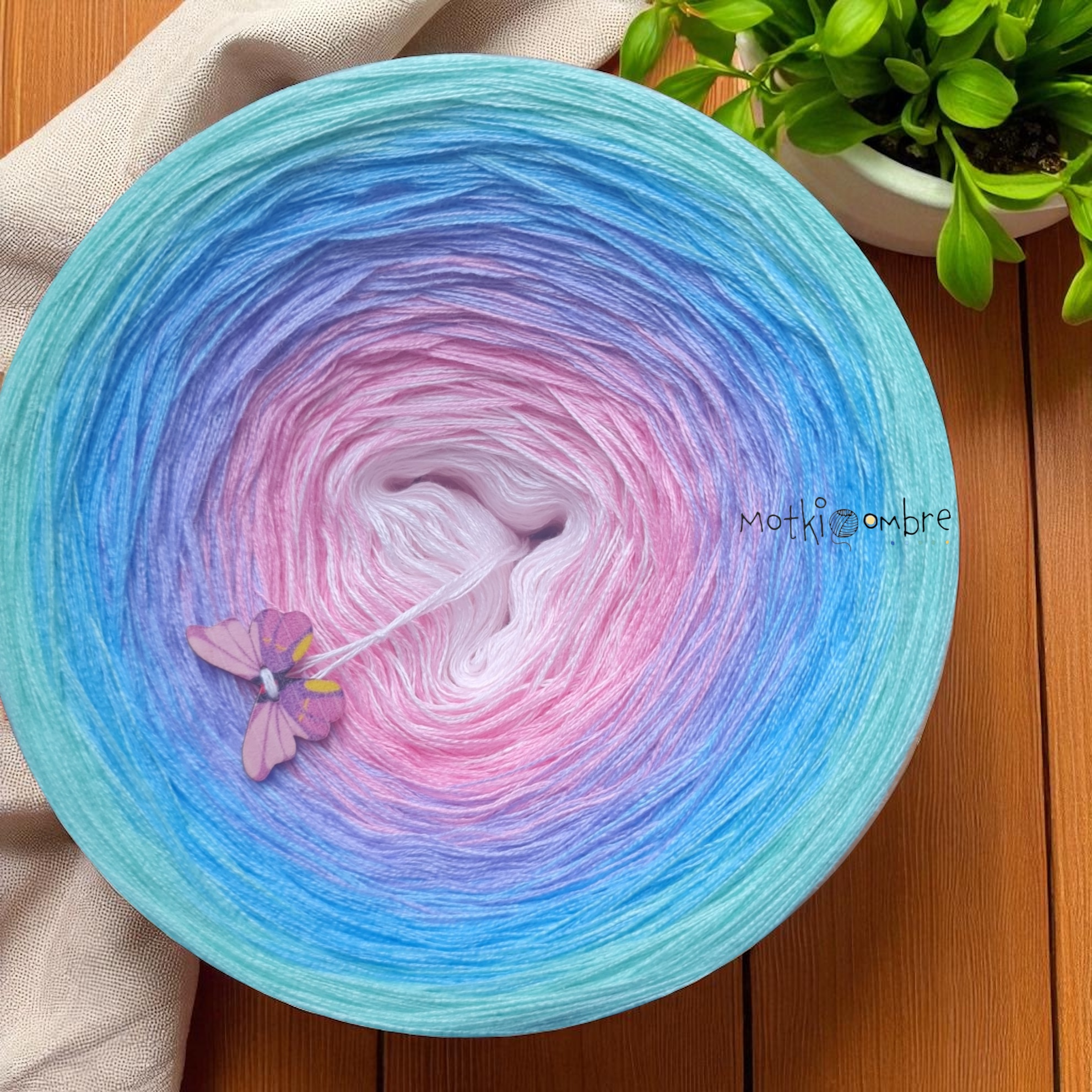 skład : bawełna/akryl 50%/50% Motek składa się z 3 lub 4 nitek , które nie są ze sobą skręcone , kolory zmieniają się nitka po nitce . Przejścia kolorów nie są równe , lecz są proporcjonalne ,co oznacza , że środkowego koloru jest najmniej a zewnętrznego najwięcej . Pozwala to na uzyskanie efektu równych pasów w chustach. Zalecane użycie motka@ombre – od środka . Zalecane szydełko 2-4mm Jakiej długości potrzebujesz ? 500m-mała chusta dla dziecka 1000m – średnia chusta , prosty wzór 1500 – duża chusta , prosty wzór 1800-2000m – chusta z dużą ilością reliefów . Staramy się aby zdjęcia odzwierciedlały jak najdokładniej rzeczywiste kolory przędzy jednak mogą one się w niewielkim stopniu różnić od rzeczywistości Zawieszka jest elementem dodatkowym , nie obowiązkowym . Staramy się aby utrzymać ciagłość kolorów lecz z powodu dostaw różnych partii towaru , odcienie mogą się nieznacznie różnić