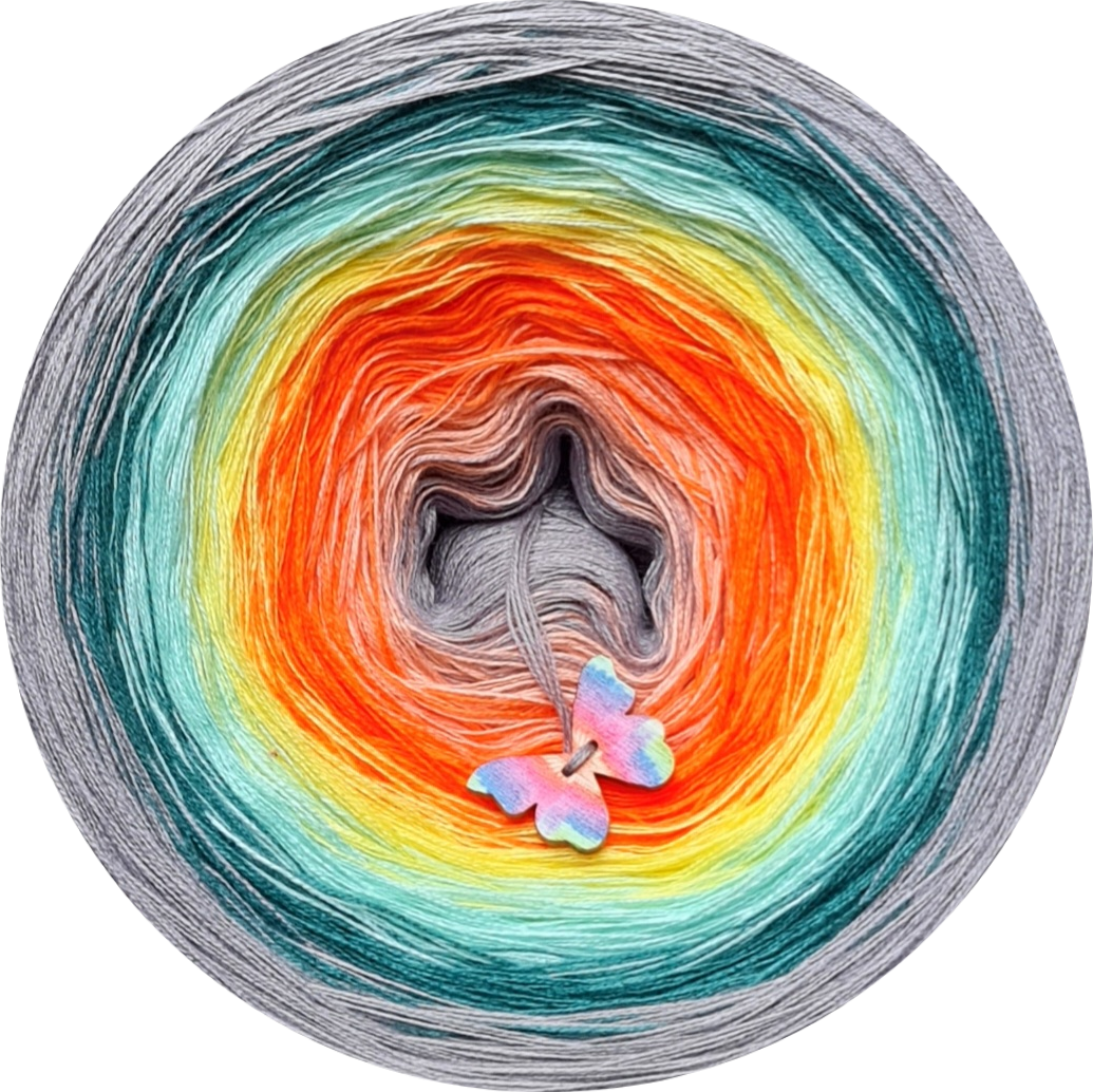 skład : bawełna/akryl 50%/50% Motek składa się z 3 lub 4 nitek , które nie są ze sobą skręcone , kolory zmieniają się nitka po nitce . Przejścia kolorów nie są równe , lecz są proporcjonalne ,co oznacza , że środkowego koloru jest najmniej a zewnętrznego najwięcej . Pozwala to na uzyskanie efektu równych pasów w chustach. Zalecane użycie motka@ombre – od środka . Zalecane szydełko 2-4mm Jakiej długości potrzebujesz ? 500m-mała chusta dla dziecka 1000m – średnia chusta , prosty wzór 1500 – duża chusta , prosty wzór 1800-2000m – chusta z dużą ilością reliefów . Staramy się aby zdjęcia odzwierciedlały jak najdokładniej rzeczywiste kolory przędzy jednak mogą one się w niewielkim stopniu różnić od rzeczywistości Zawieszka jest elementem dodatkowym , nie obowiązkowym . Staramy się aby utrzymać ciagłość kolorów lecz z powodu dostaw różnych partii towaru , odcienie mogą się nieznacznie różnić
