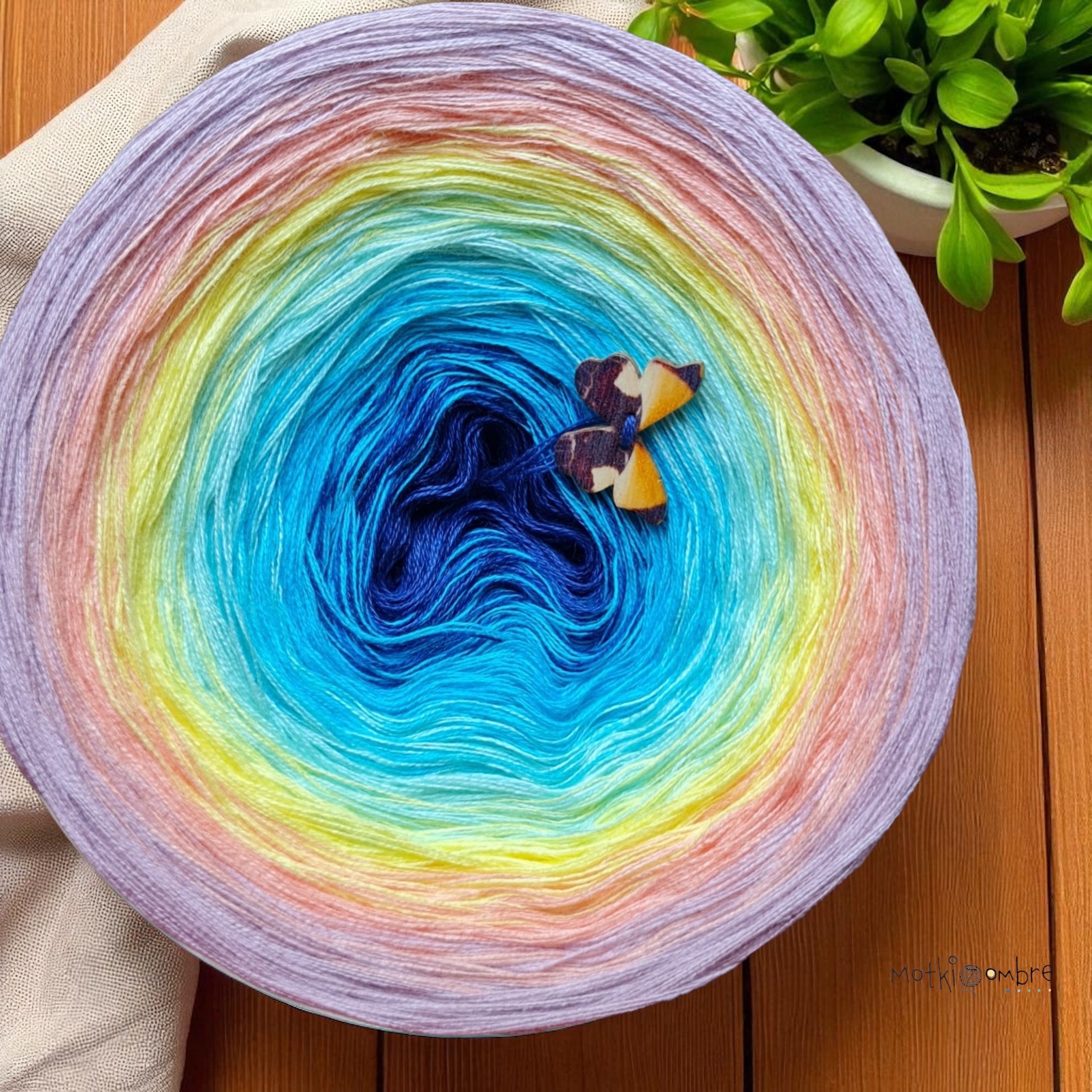 skład : bawełna/akryl 50%/50% Motek składa się z 3 lub 4 nitek , które nie są ze sobą skręcone , kolory zmieniają się nitka po nitce . Przejścia kolorów nie są równe , lecz są proporcjonalne ,co oznacza , że środkowego koloru jest najmniej a zewnętrznego najwięcej . Pozwala to na uzyskanie efektu równych pasów w chustach. Zalecane użycie motka@ombre – od środka . Zalecane szydełko 2-4mm Jakiej długości potrzebujesz ? 500m-mała chusta dla dziecka 1000m – średnia chusta , prosty wzór 1500 – duża chusta , prosty wzór 1800-2000m – chusta z dużą ilością reliefów . Staramy się aby zdjęcia odzwierciedlały jak najdokładniej rzeczywiste kolory przędzy jednak mogą one się w niewielkim stopniu różnić od rzeczywistości Zawieszka jest elementem dodatkowym , nie obowiązkowym . Staramy się aby utrzymać ciagłość kolorów lecz z powodu dostaw różnych partii towaru , odcienie mogą się nieznacznie różnić