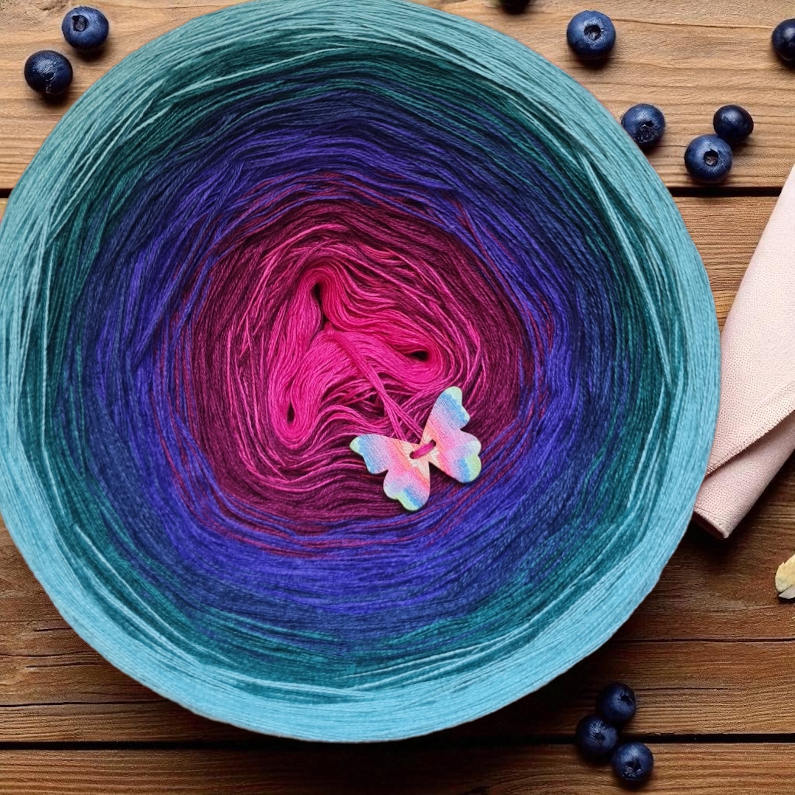 skład : bawełna/akryl 50%/50% Motek składa się z 3 lub 4 nitek , które nie są ze sobą skręcone , kolory zmieniają się nitka po nitce . Przejścia kolorów nie są równe , lecz są proporcjonalne ,co oznacza , że środkowego koloru jest najmniej a zewnętrznego najwięcej . Pozwala to na uzyskanie efektu równych pasów w chustach. Zalecane użycie motka@ombre – od środka . Zalecane szydełko 2-4mm Jakiej długości potrzebujesz ? 500m-mała chusta dla dziecka 1000m – średnia chusta , prosty wzór 1500 – duża chusta , prosty wzór 1800-2000m – chusta z dużą ilością reliefów . Staramy się aby zdjęcia odzwierciedlały jak najdokładniej rzeczywiste kolory przędzy jednak mogą one się w niewielkim stopniu różnić od rzeczywistości Zawieszka jest elementem dodatkowym , nie obowiązkowym . Staramy się aby utrzymać ciagłość kolorów lecz z powodu dostaw różnych partii towaru , odcienie mogą się nieznacznie różnić