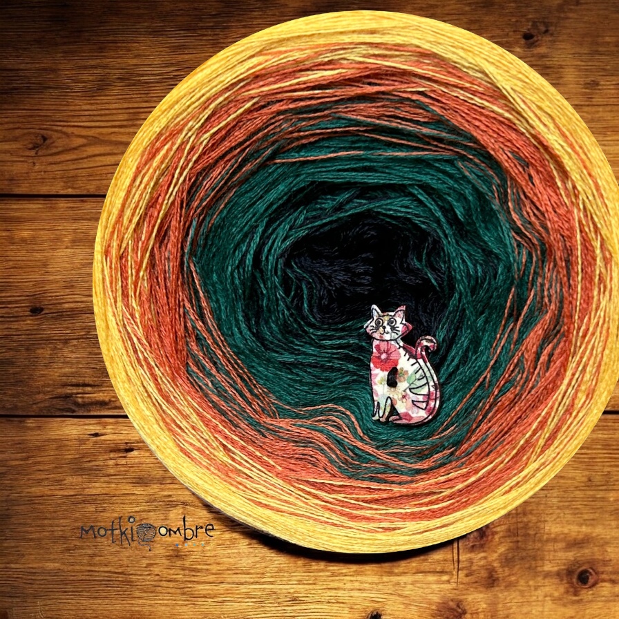 Motek Ombre jest nawijany ręcznie , z długimi przejściami kolorystycznymi , kolory zmieniają się nitka po nitce tworząc efekt ombre .