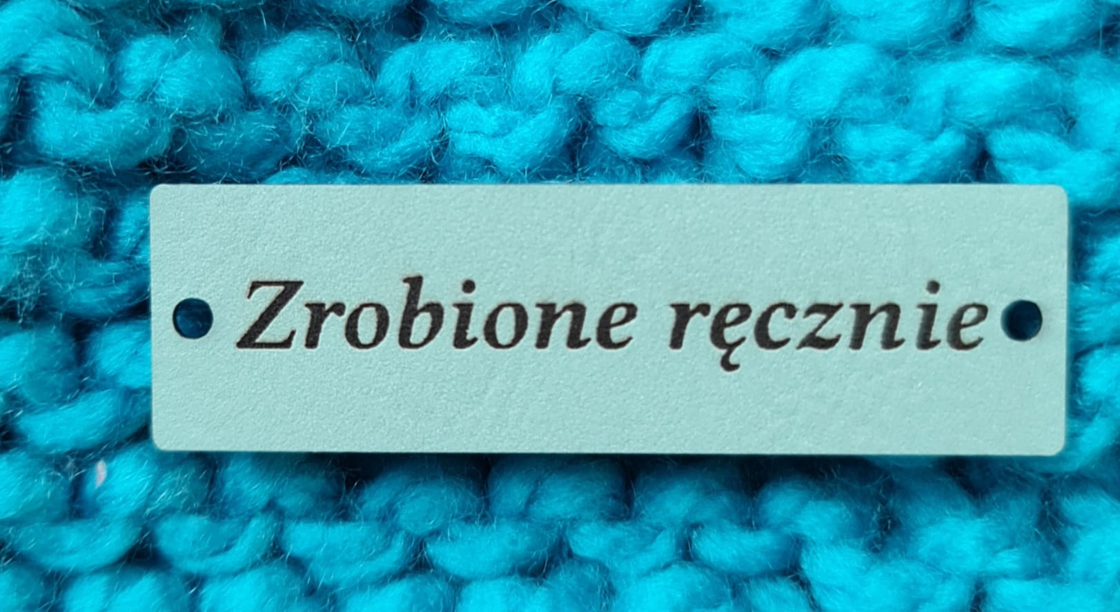 Naszywka z eko-skóry z napisam ZROBIONE RĘCZNIE , wymiary 50mmx15mm , kolor błękitny, 1 szt