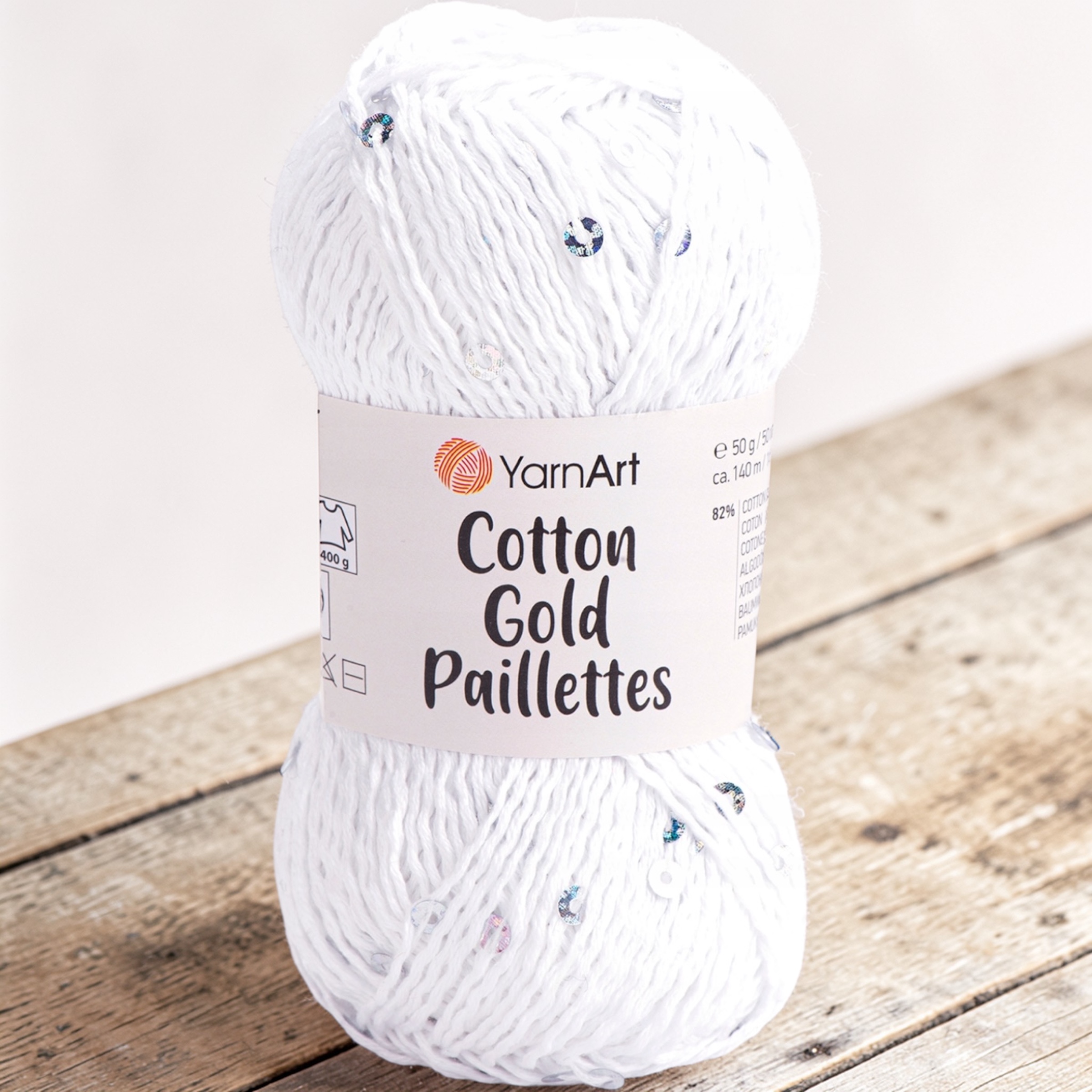 100% styl, 0% kompromisów – Cotton Gold Paillettes to lekka włóczka z naturalnej bawełny z dodatkiem poliestru, wzbogacona delikatnymi cekinami, które nadają każdemu projektowi eleganckiego połysku.