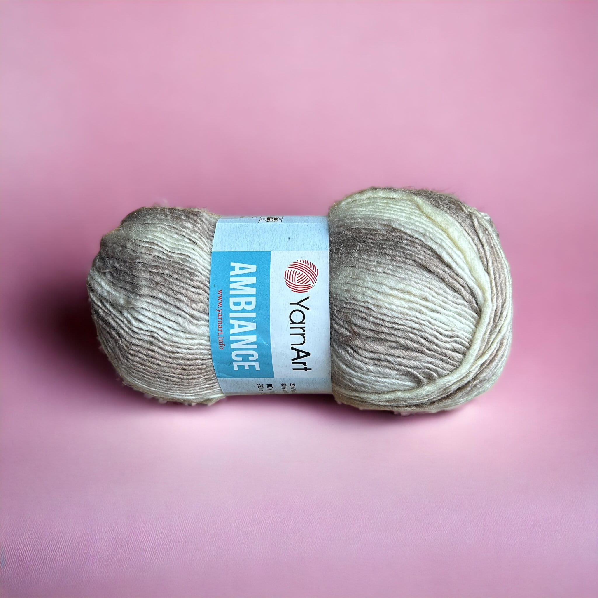 Włóczka Ambiance to włóczka w pięknych kolorowych barwach, układających się w pasy. Jest ciepła, miękka w dotyku i nie gryząca. Idealna na wyroby jesienno - zimowe np. czapki, swetry, szale, chusty itp. Skład: 20% wełna, 80% akryl Waga / długość: 100 g / 250 m Proponowany rozmiar drutów: 4 mm Proponowany rozmiar szydełka: 4 mm Zalecane pranie w 40 C., suszyć na płasko, nie prasować. Producent do wykonania swetra zaleca: Sweter ok. 500 gram Wyprodukowano w Turcji .